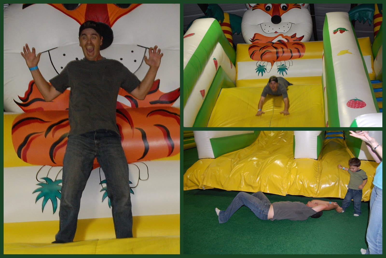 We took our first trip to Jungle Zone. It's an indoor inflatable fun park with slides and all sorts of fun stuff including an arcade. We had a whole group in attendance, there was Tim, Crystal and Parker, Kiley and Tristin, and Mommy and Dani. Uncle Time was all about Danica that day :) including showing her how to go through the wall of the bounce house since she was too short to climb over it (see the bottom left picture in the collage).